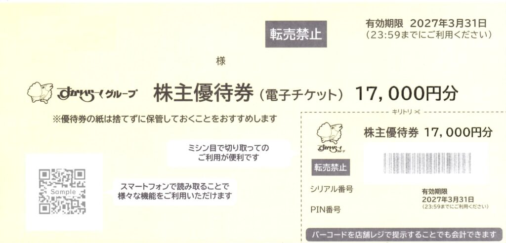 1,000株なので「17,000円分の電子チケット」です。