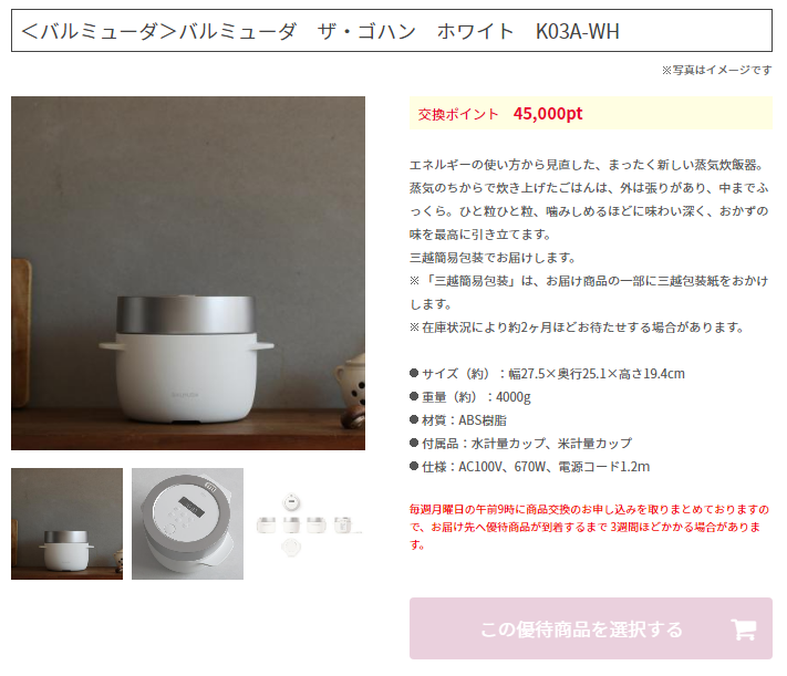 先ほど専用サイトの会員登録を済ませましたが、1,950商品(100~60,000ポイント)が掲載されていました。もう少しポイントがあれば、バルミューダ ザ・ゴハンなんかいいなあと思いましたが、どれにしようか迷いますね。