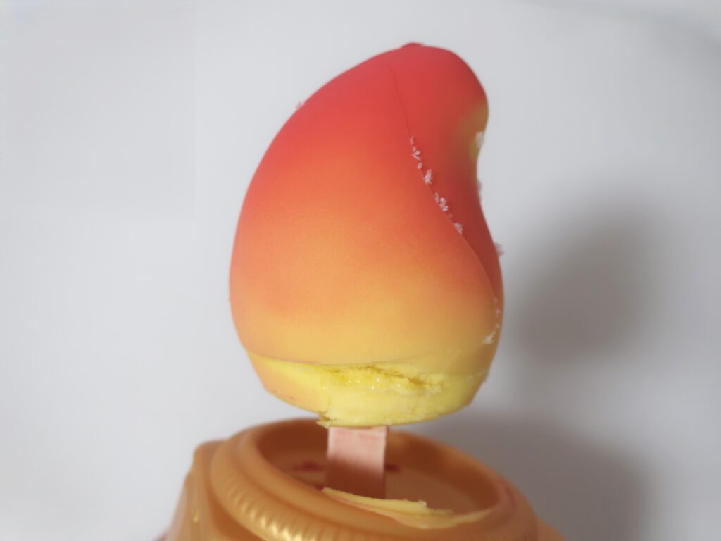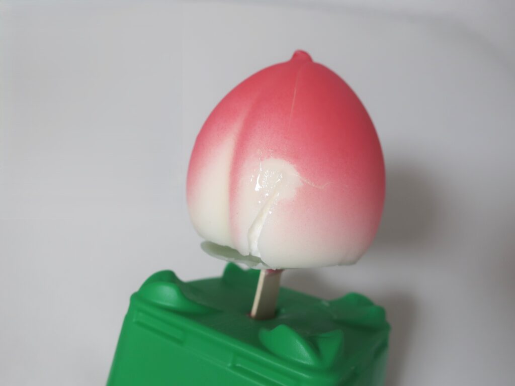 果物を再現した立体的な見た目が特徴で、外側がホワイトチョコ、内側がフルーツソルベの二層構造になっています。見た目のインパクトからSNSを中心に注目を集め、発売当初は売り切れが続出していたようです。