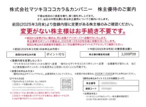 2024年9月末の優待分から、従来の紙の商品券は「マツキヨココカラポイント」へ変更されました。