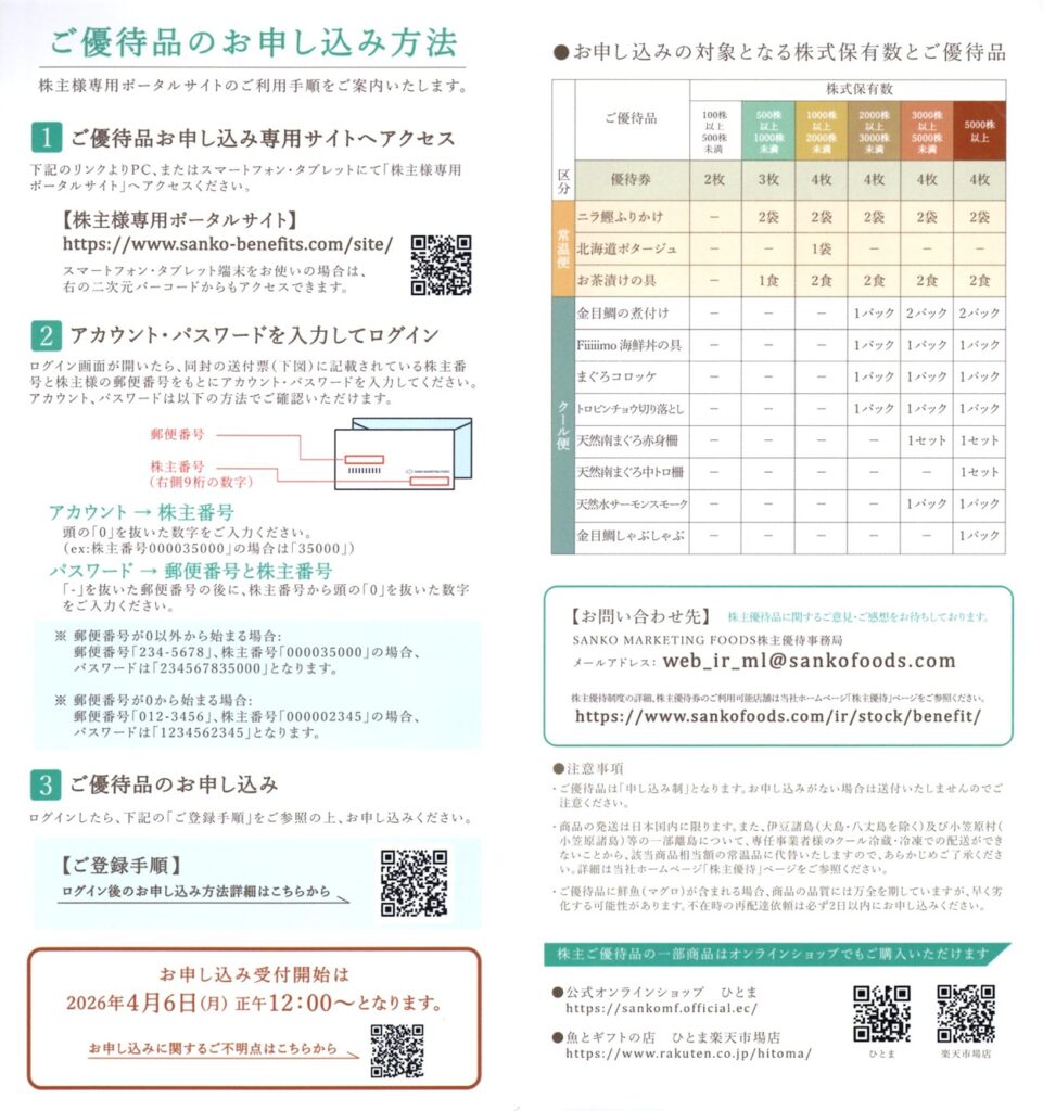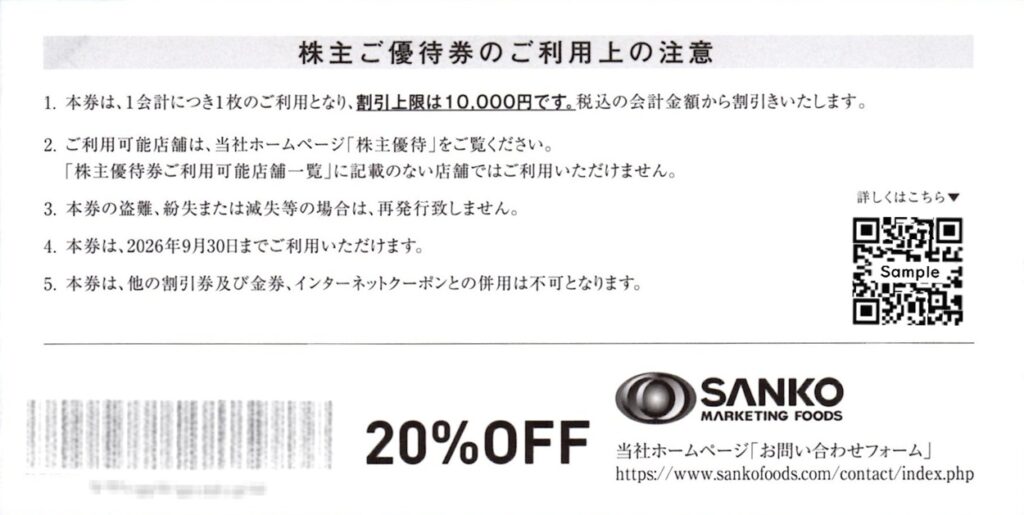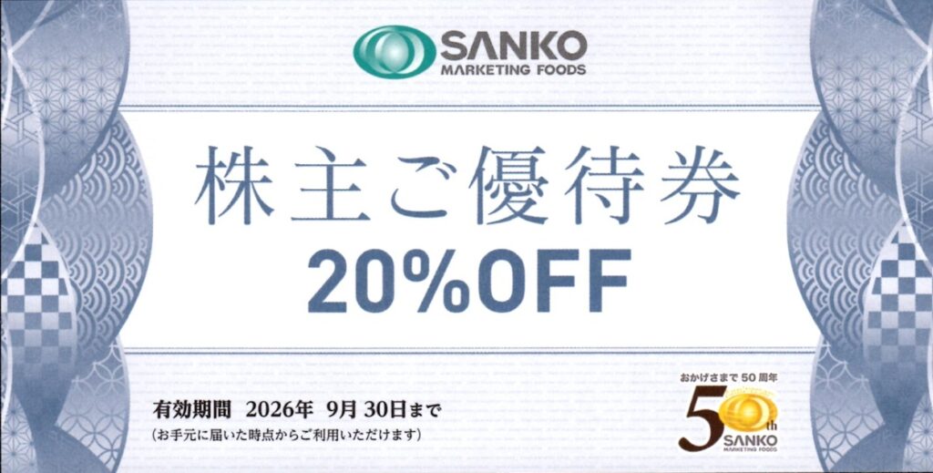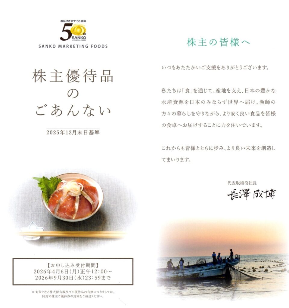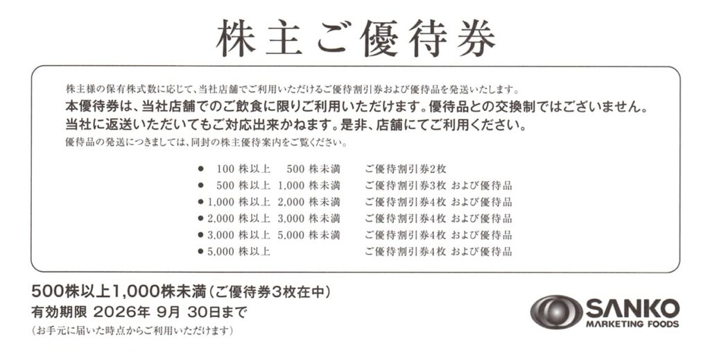 今回は、飲食施設の運営受託事業や水産事業でおなじみのSANKO MARKETING FOODS(2762)から届いた株主優待を紹介します。