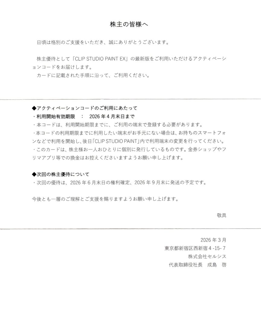 今回は、イラスト制作ソフトのCLIP STUDIOでおなじみのセルシス(3663)から届いた株主優待を紹介します。