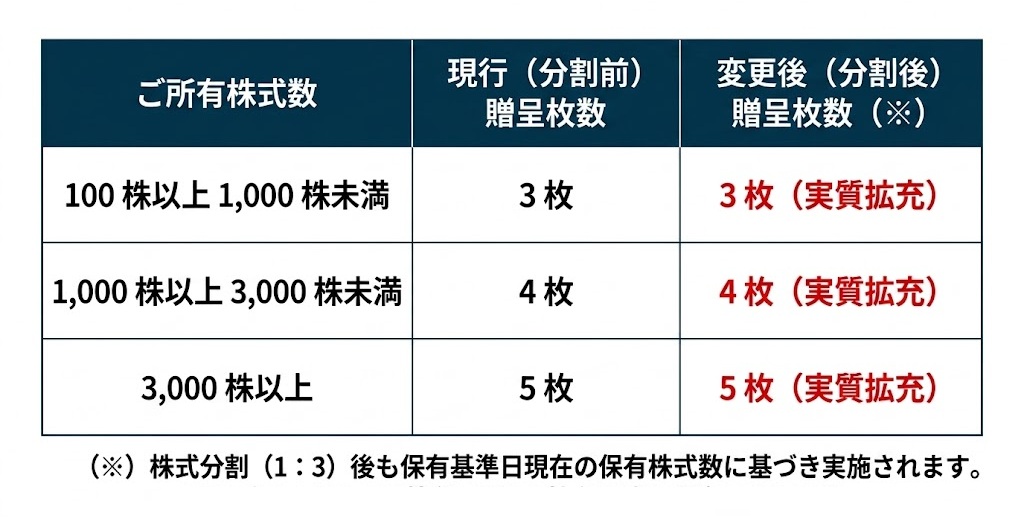 2026年4月1日効力発生の1株→3株の株式分割に伴い、株主優待制度の適用基準を実質的に拡大すると発表しました。分割後も100株(1単元)以上の保有で優待の対象となり、より少ない投資で優待を受けられるようになります。優待内容は「株主優待割引券(20%割引券)」で、変更はありません。2026年9月末基準日分から適用されます。
