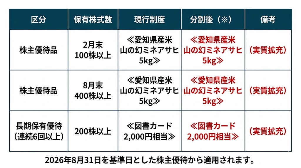 2026年5月31日を基準日として1株につき2株の株式分割を実施すること、およびこれに伴株主優待制度の実質的な拡充を発表しました。株式分割後も現行の優待基準は維持されるので、実質的に拡充となる内容です。2026年8月末から適用開始となります。