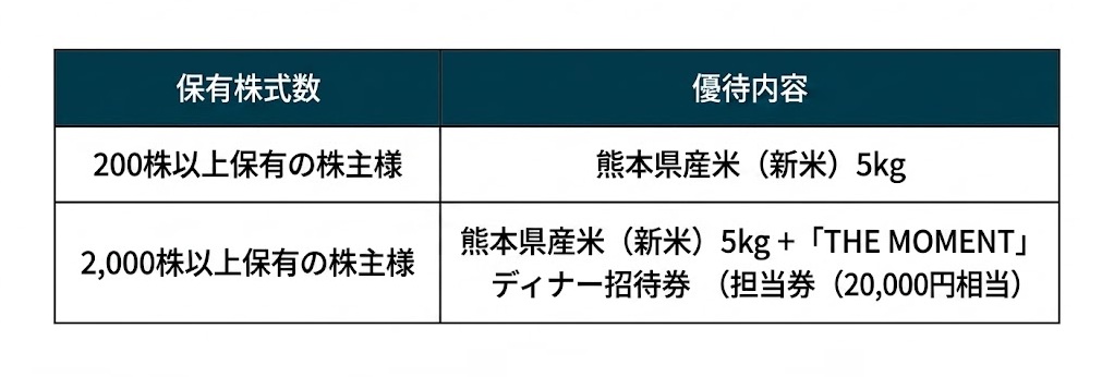 2026年6月末の株主を対象に株主優待を実施すると発表しました。200株以上で熊本県産米5kg、2,000株以上で熊本県産米5kgとフレンチ・鉄板焼きレストラン「THE MOMENT」のディナー招待券(20,000円相当)を贈呈。内容は前回から変更はなく、優待品は11月中旬頃より順次発送される予定です。