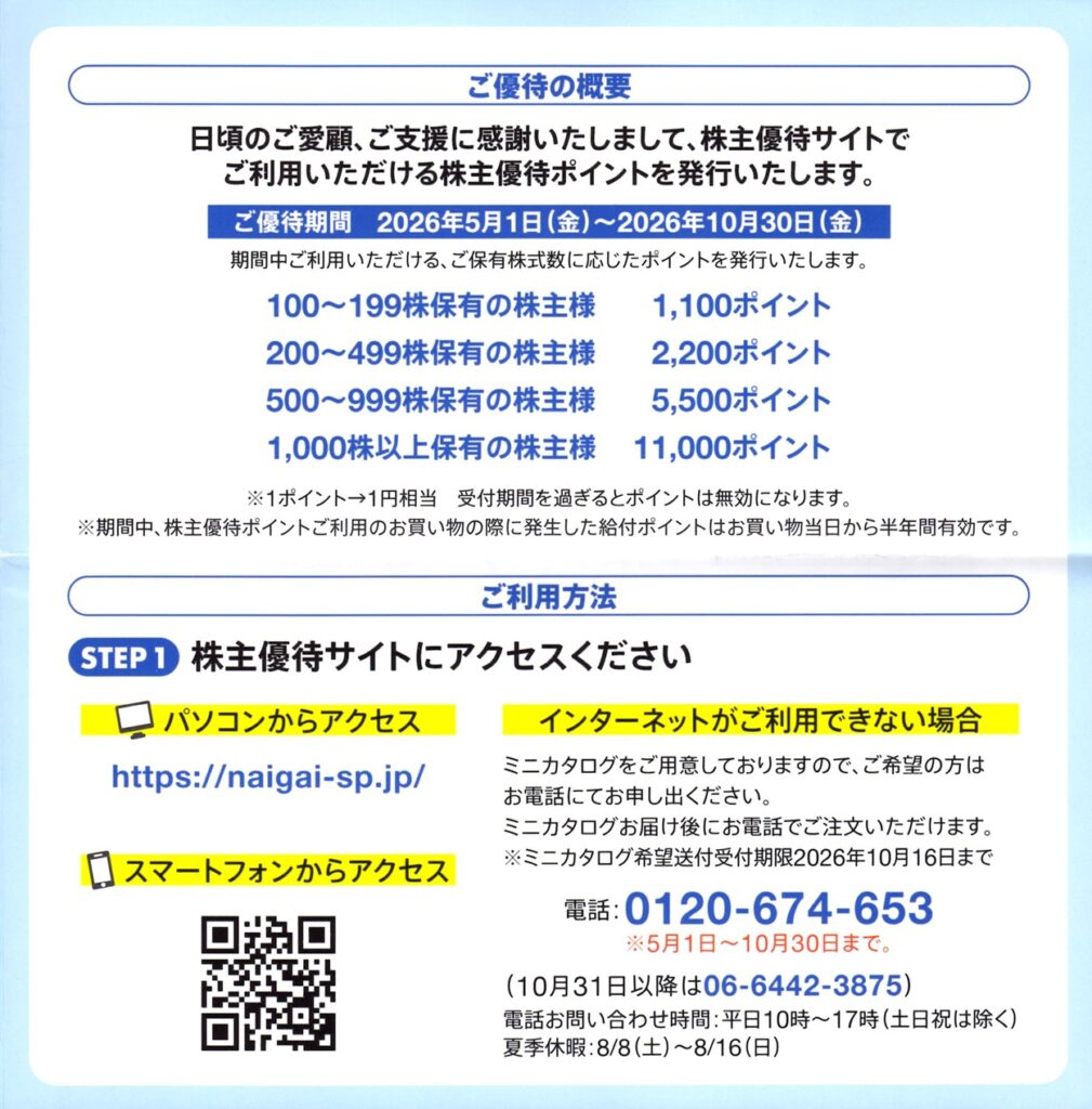 ナイガイでは、毎年1月末の権利確定日に以下の内容の優待がもらえます。