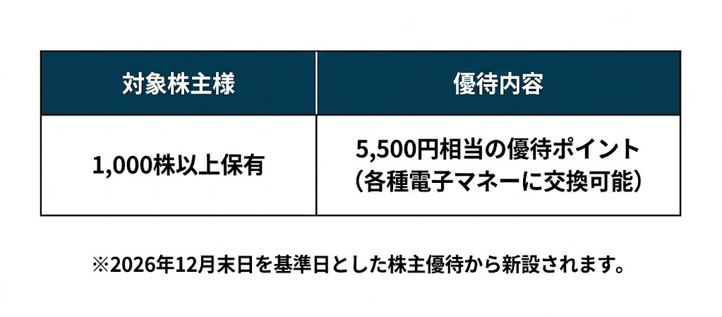 株主優待制度の導入を発表しました。毎年12月末時点で1,000株以上を保有する株主を対象に、電子マネー等に交換可能な5,500円相当の優待ポイントが一律で進呈されます。2026年12月末時点の株主より開始され、配当と合わせた総利回りは5%を超える高水準な内容となっています。