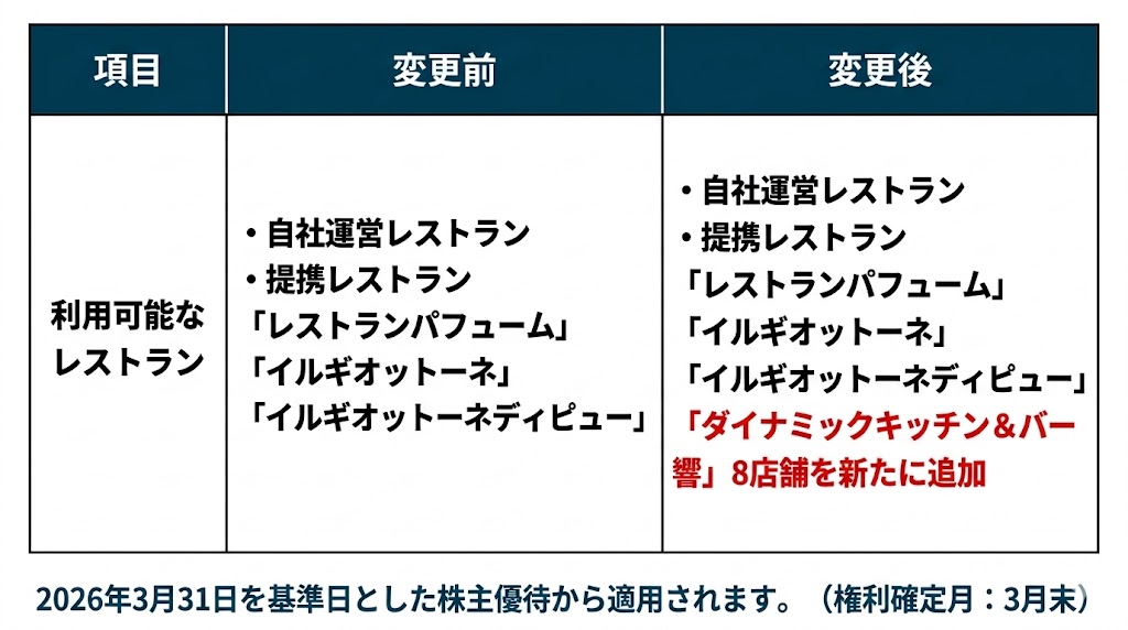 株主優待制度の拡充を発表しました。ウエディング事業の優待券が利用できる提携レストランとして、新たに「ダイナミックキッチン&バー 響」の8店舗が追加されました。2026年3月末基準日の株主より、より幅広い店舗で優待割引が利用可能となります。