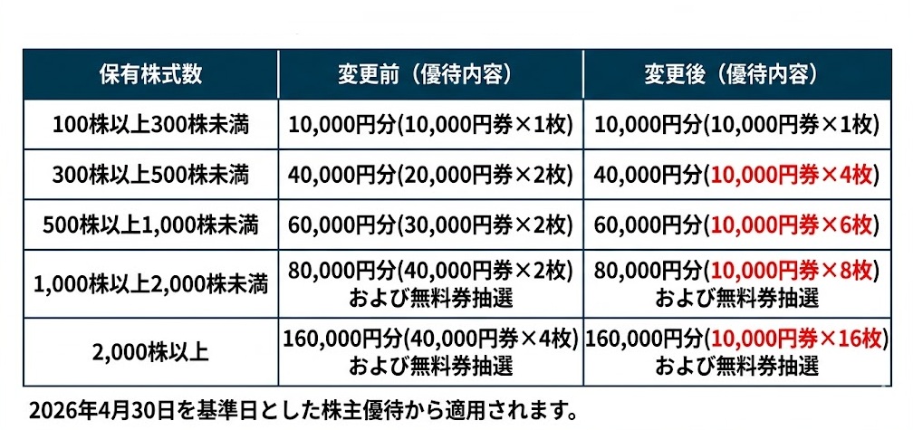 2026年12月1日より適用される優待制度変更(1,000円ごとに500円割引券1枚利用)に関するQ&Aを公開しました。12月1日時点で有効な全優待に適用され、一度の会計での利用枚数制限についても具体例を挙げて説明しています。利用条件が「実質半額まで」となる大きな変更のため、既存株主は内容の再確認をおすすめします。