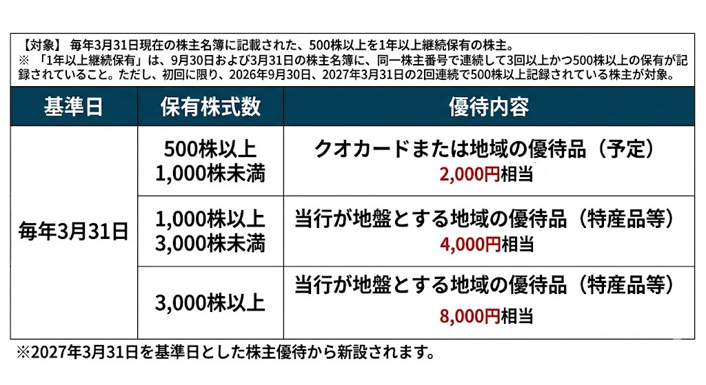 2027年3月末より株主優待制度を新設します。対象は毎年3月末時点で500株以上を1年以上継続保有する株主です(初回のみ2026年9月末と2027年3月末の連続保有で対象)。500株以上で2,000円相当のクオカードまたは地域特産品、1,000株以上で4,000円相当、3,000株以上で8,000円相当の地域特産品が専用サイトにて選択可能です。