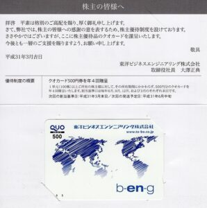 ビジネスエンジニアリング(4828)から株主優待が到着