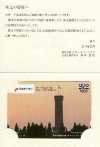 権利確定日は2018年9月末。保有株式数は100株。届いた優待品「1,000円分のクオカード」を写真で紹介します。