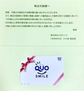 100株(3年未満)なので「1,000円分のクオカード」でした。