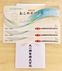 権利確定日は2020年3月末。保有株式数は100株。届いた優待品「3kg分のおこめギフト券」を写真で紹介します。
