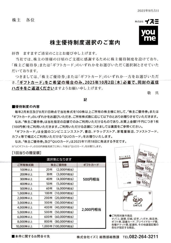 イズミでは、毎年 2月末と8月末 の年2回、保有株数に応じて「株主優待券」または「クオカード」がもらえます。