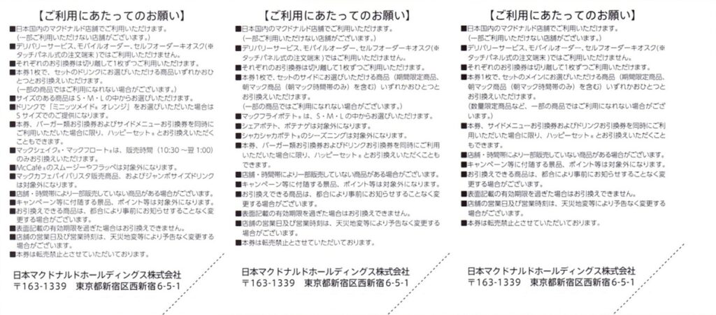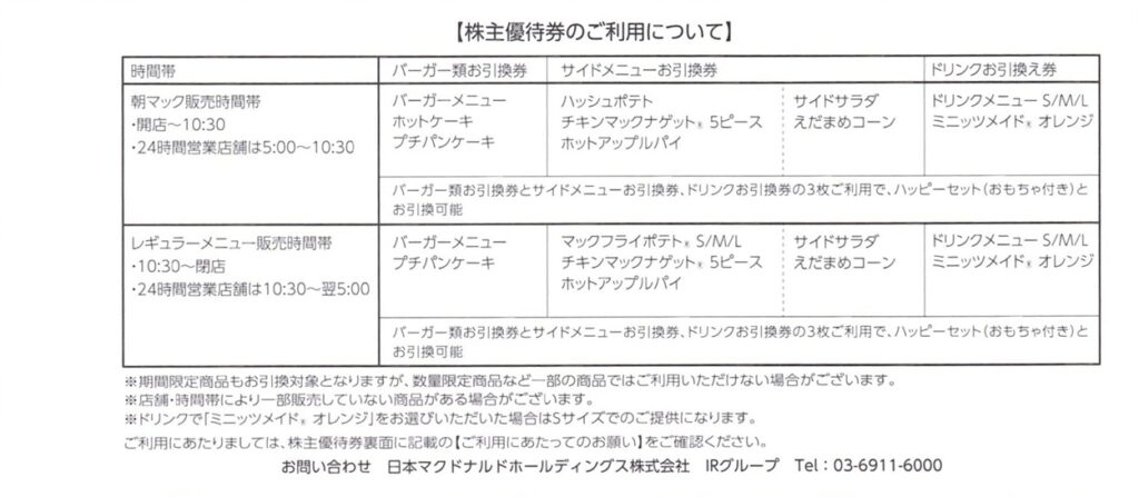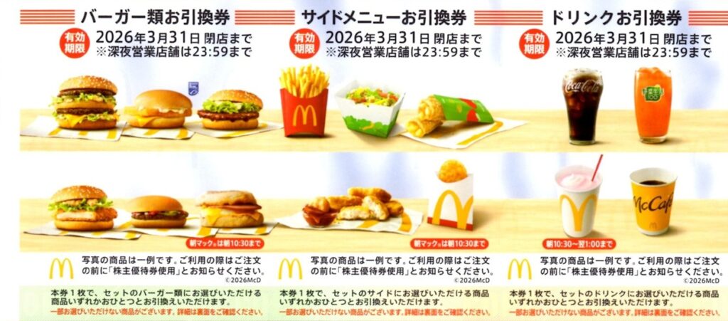 日本マクドナルドホールディングスでは、毎年 6月末・12月末 の権利確定日に以下の優待がもらえます。
