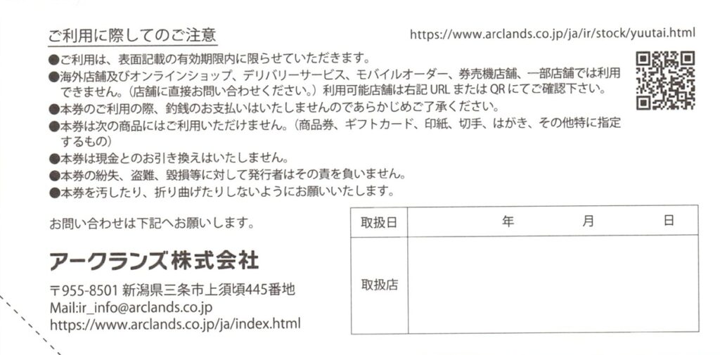 アークランズでは、毎年2月末と8月末の権利確定日に、保有株数に応じて株主優待券がもらえます。