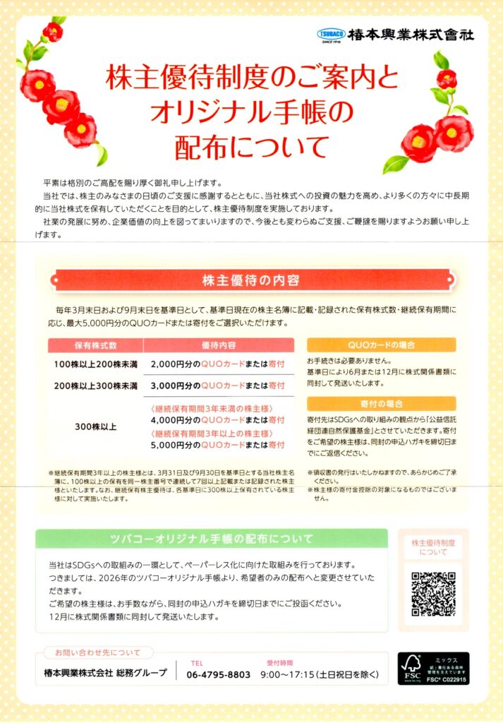 今回は、各種機械器具の販売で知られる 椿本興業(8052) から届いたオリジナル手帳の案内を紹介します。