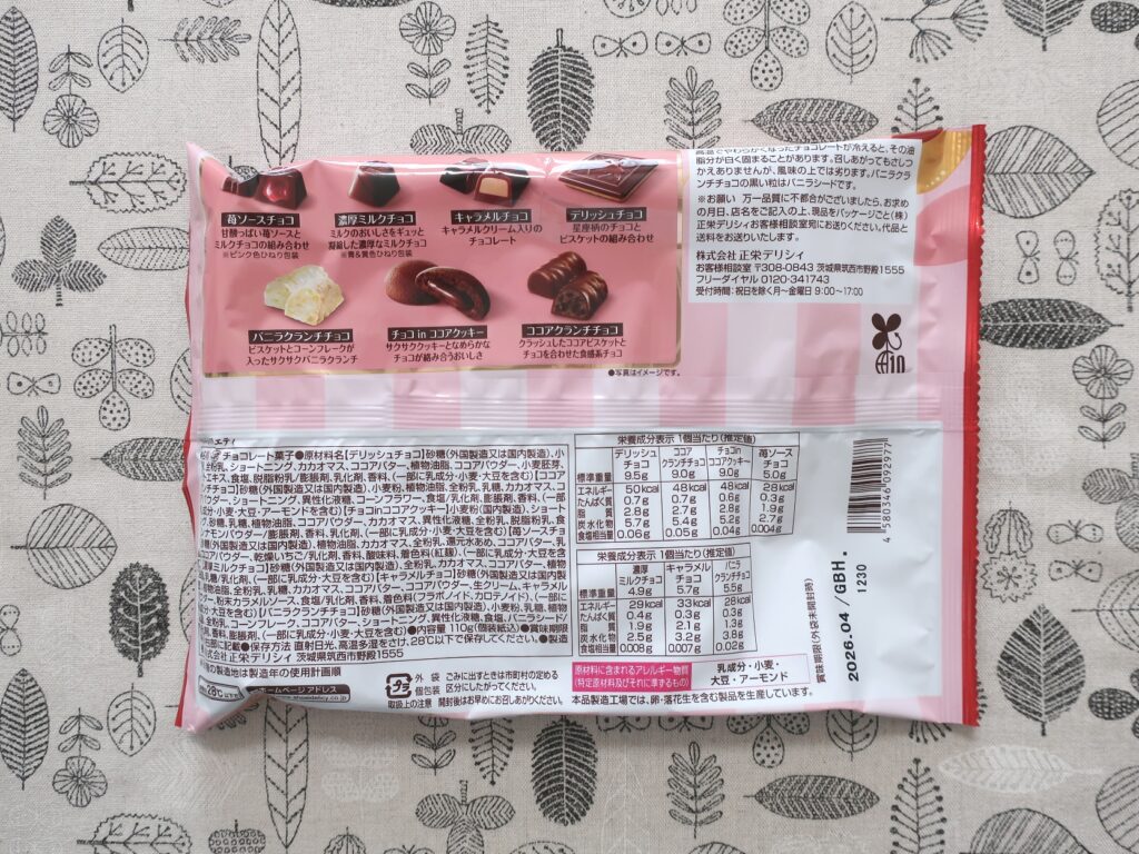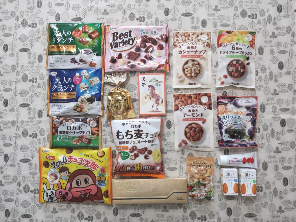 内容はチョコレート、ナッツ、ドライフルーツなど人気商品がバランスよく入っています。