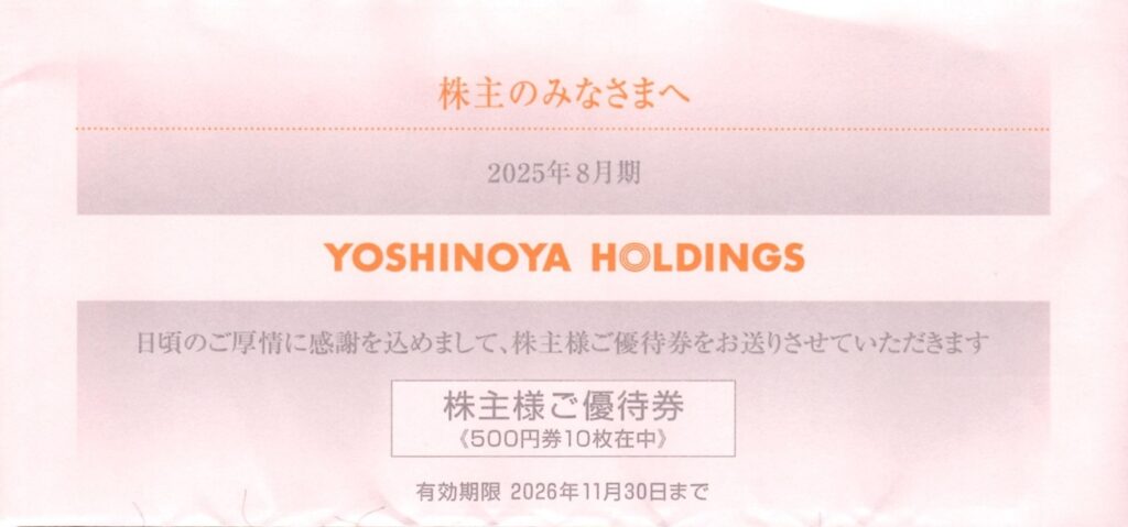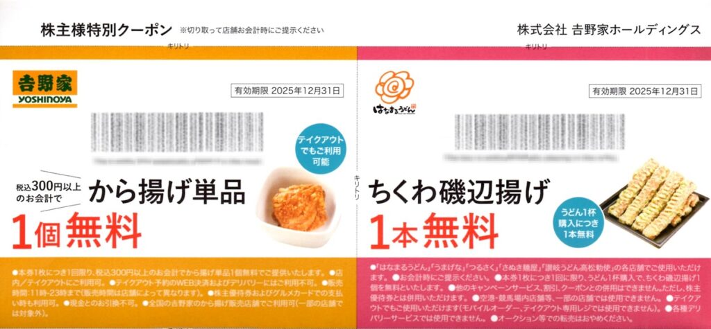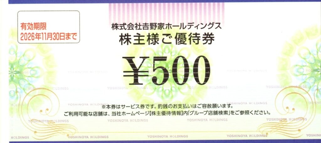 吉野家ホールディングスでは、毎年 2月末・8月末 に権利確定日があり、保有株数に応じて優待券がもらえます。
