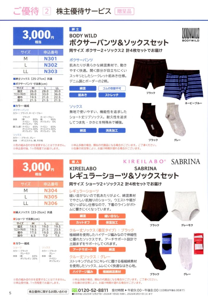 グンゼでは、毎年3月末・9月末の権利確定日に以下の内容の優待がもらえます。
