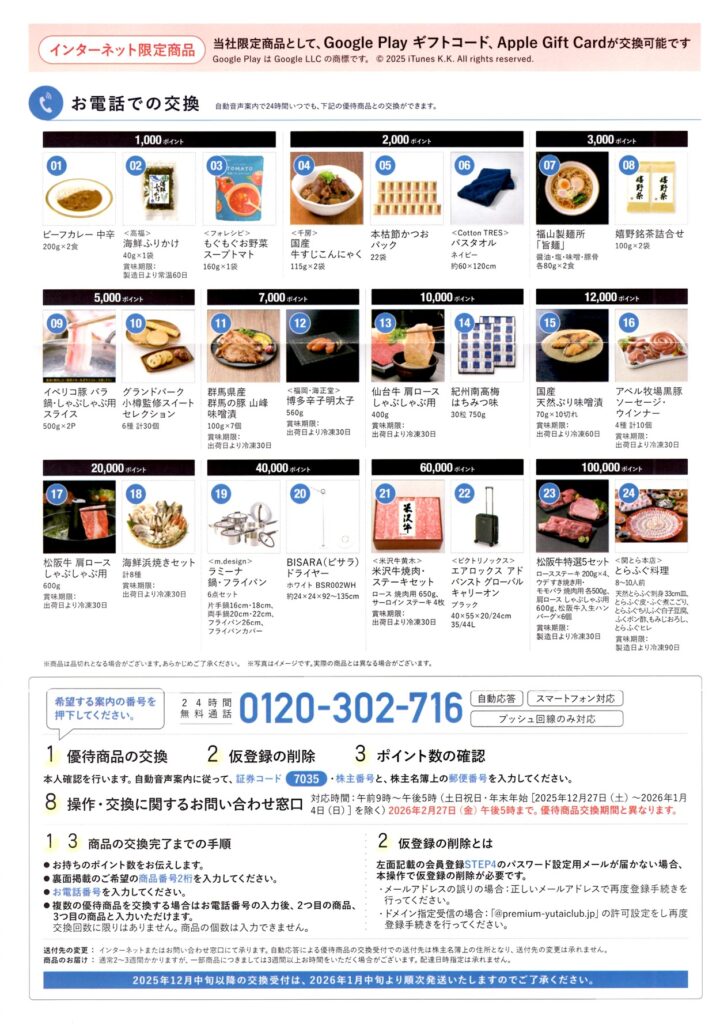 専用サイトにログインすると5,000種類以上の商品と交換可能ですが、以下の24点に限り電話でも交換可能です。