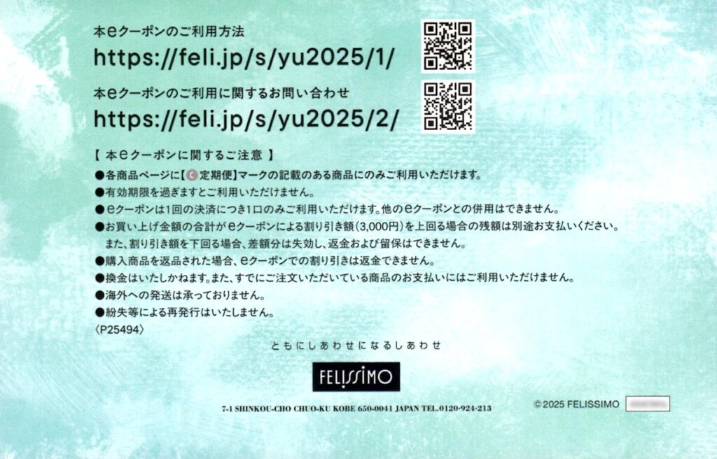 過去2回はカタログから選ぶ方式でしたが、今回はフェリシモ定期便専用のお買物eクーポンでした。