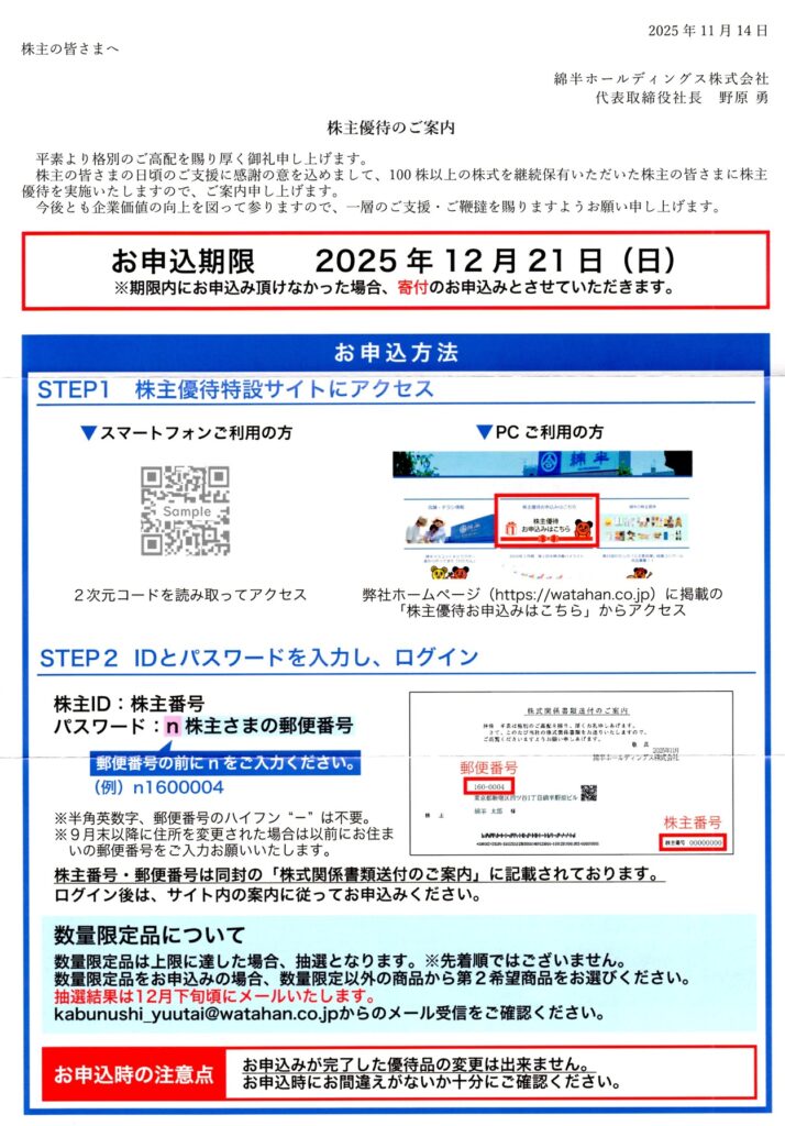 ※綿半HDの株主優待は、半年以上の継続保有が必要です。