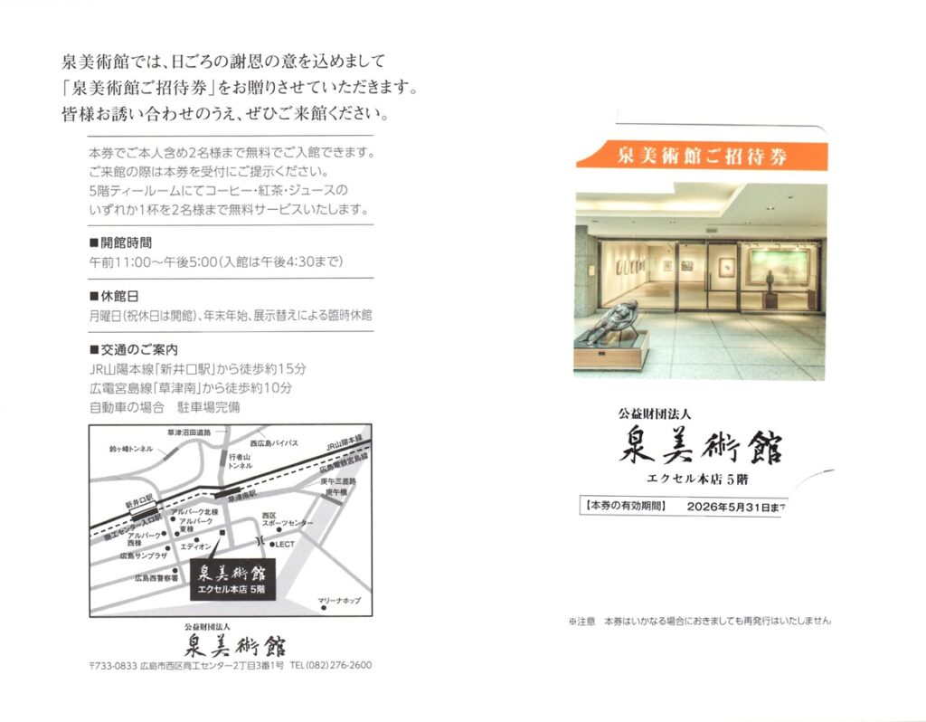 権利確定日は2020年8月末。保有株式数は100株。届いた優待品「2,000円分の株主優待券&泉美術館年間招待券」を写真で詳しく紹介します。