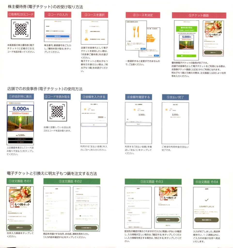 一家ホールディングスの株主優待は、毎年3月末・9月末に実施されており、保有株数に応じて「電子チケット」や「明太もつ鍋セット」が選択できます。
