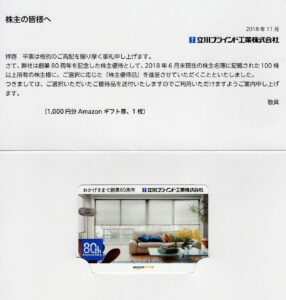 立川ブラインド工業から創業80周年記念株主優待の案内が届きました。