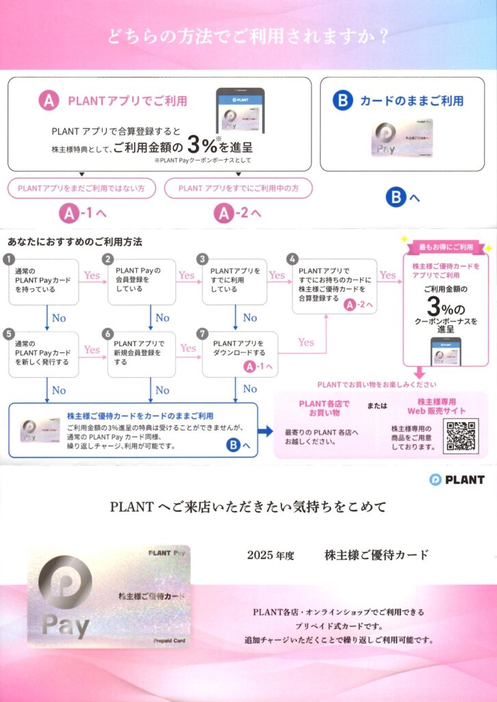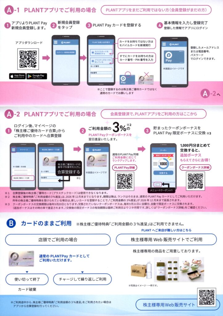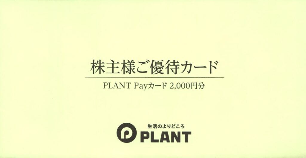 権利確定日は2024年9月20日。保有株式数は100株(1年以上)。届いた優待品「1,000円分のPLANT Payカード」を写真で詳しく紹介します。