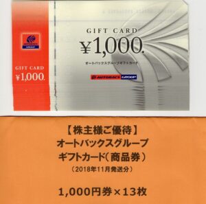 権利確定日は2018年9月末。保有株式数は1,000株(3年以上)。届いた優待品「13,000円分のオートバックスグループギフトカード」を写真で詳しく紹介します。