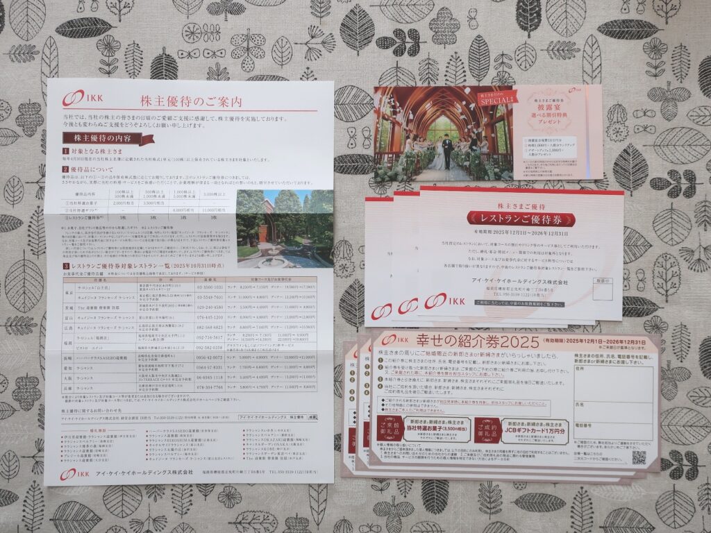 今回は、ブライダル事業でおなじみの アイ・ケイ・ケイホールディングス(2198) から届いた株主優待を紹介します。