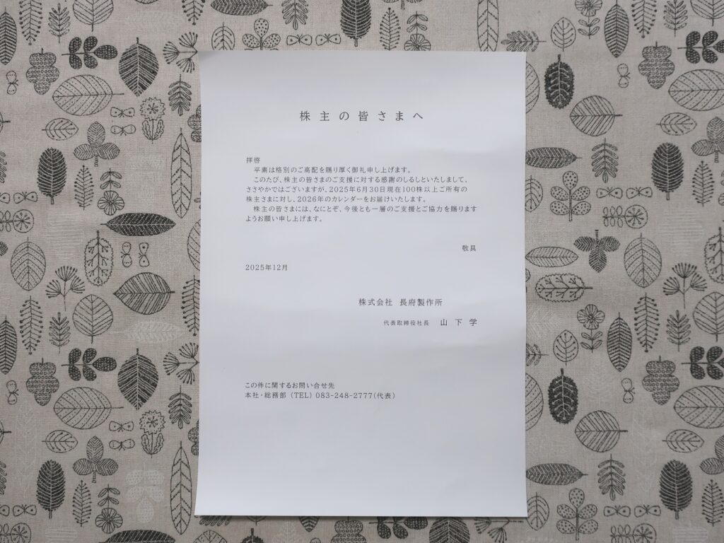 長府製作所では、毎年6月末の権利確定日に、隠れ優待としてカレンダーがもらえます。