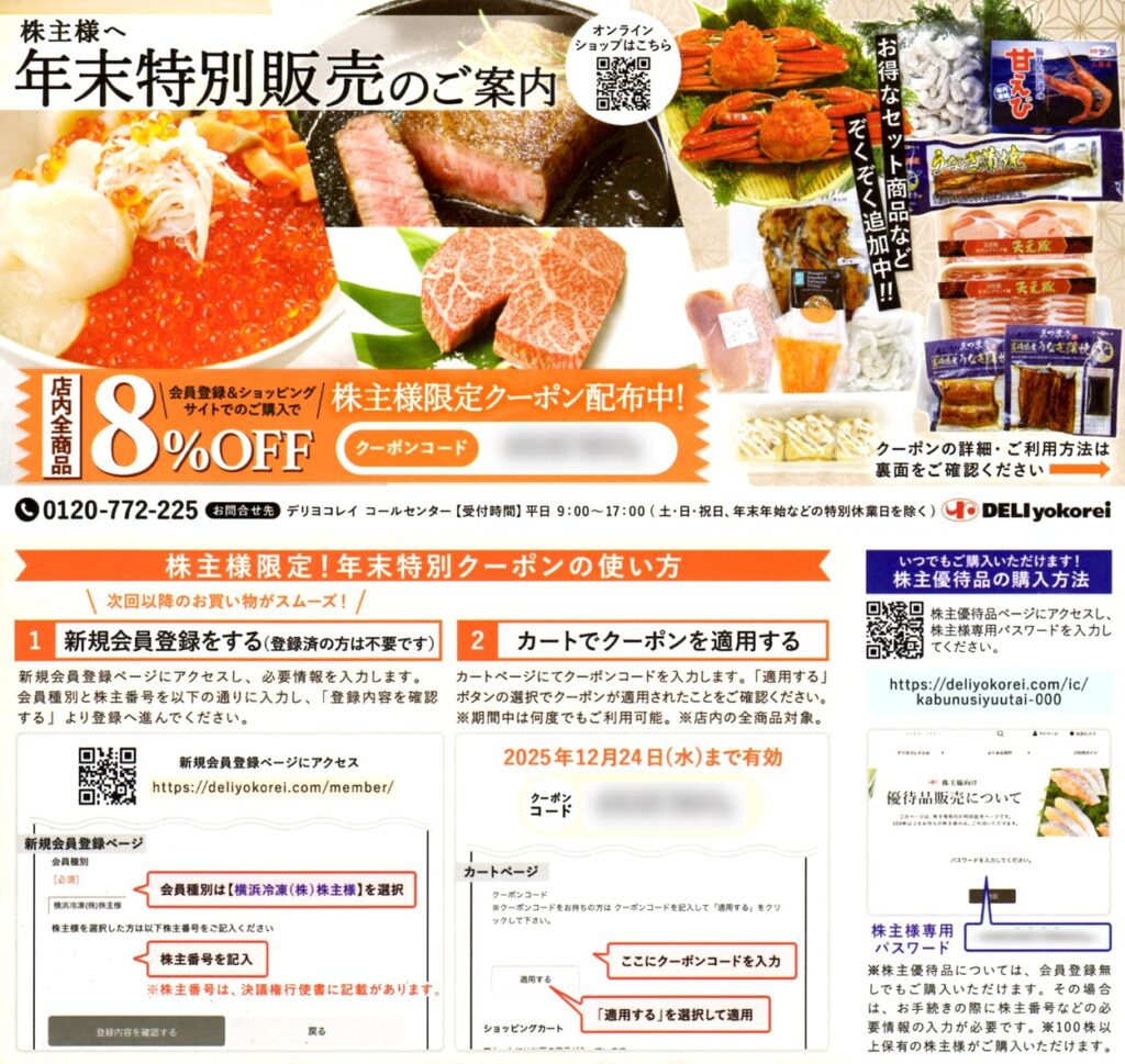 本日、横浜冷凍公式オンラインショップ「DELIyokorei」の割引クーポンが届きました。