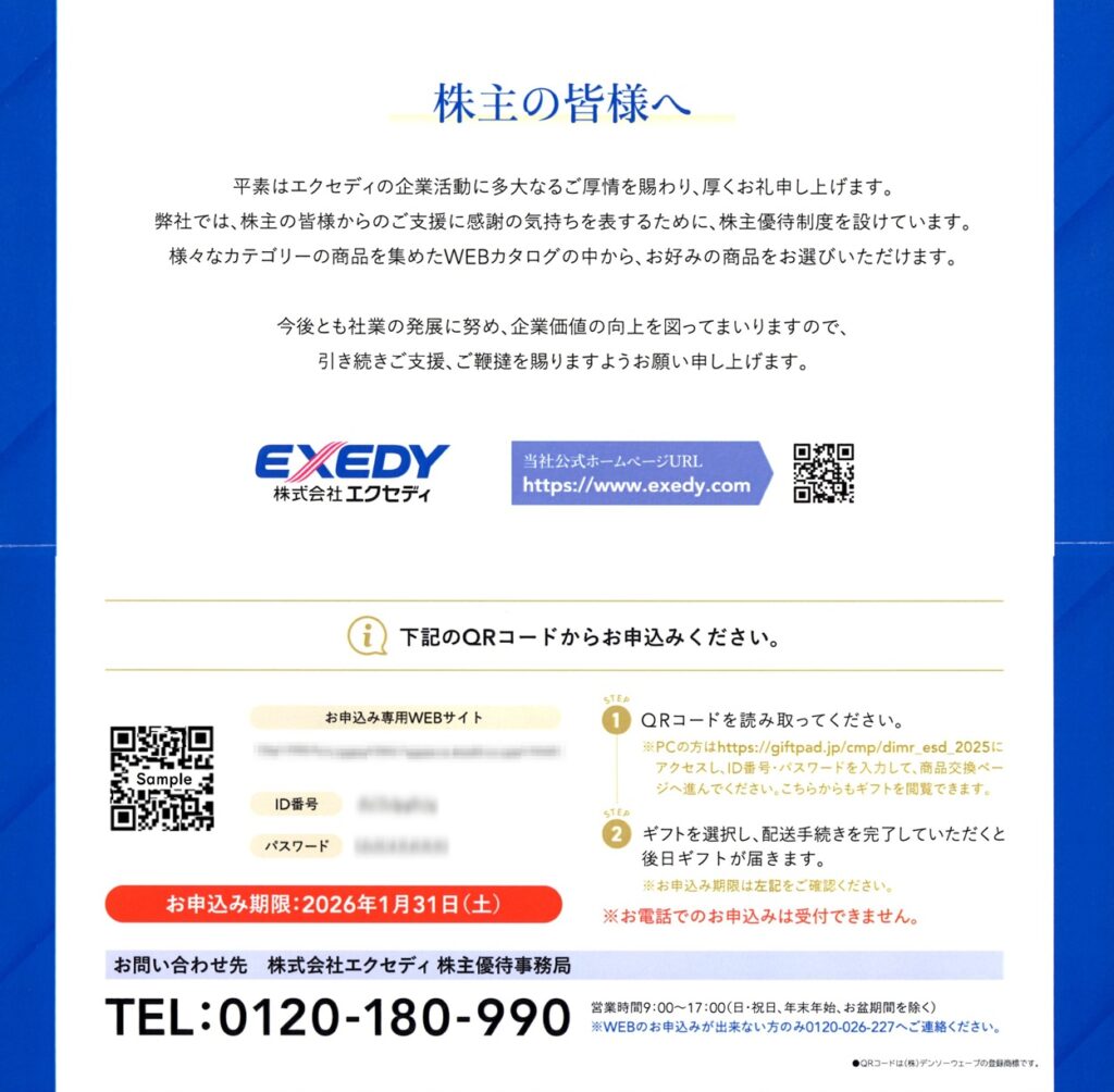 今回は、自動車部品でおなじみの エクセディ(7278) から届いた優待案内を紹介します。