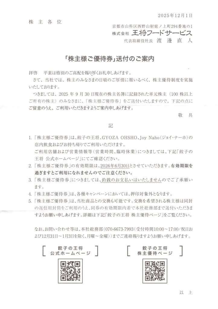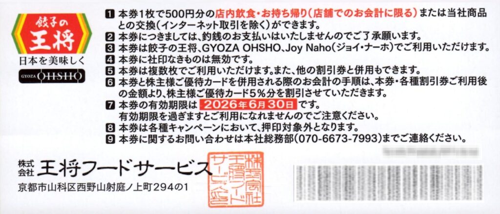 今回は、全国で「餃子の王将」を展開する 王将フードサービス(9936) から届いた株主優待を紹介します。