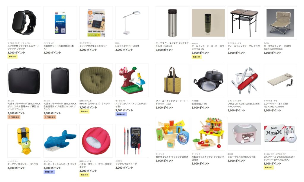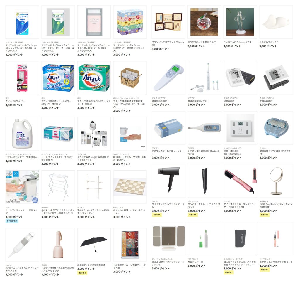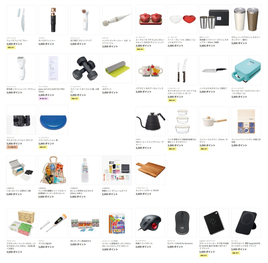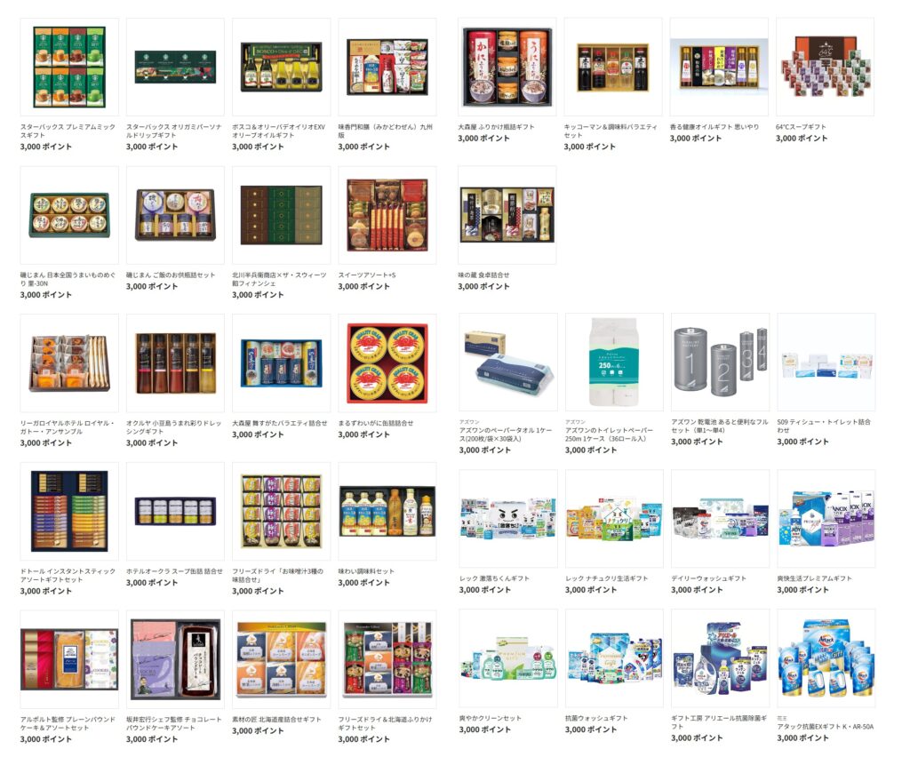 ポイントは専用Webサイトで使用でき、掲載されている「3,000円相当の商品」から自由に選べます。