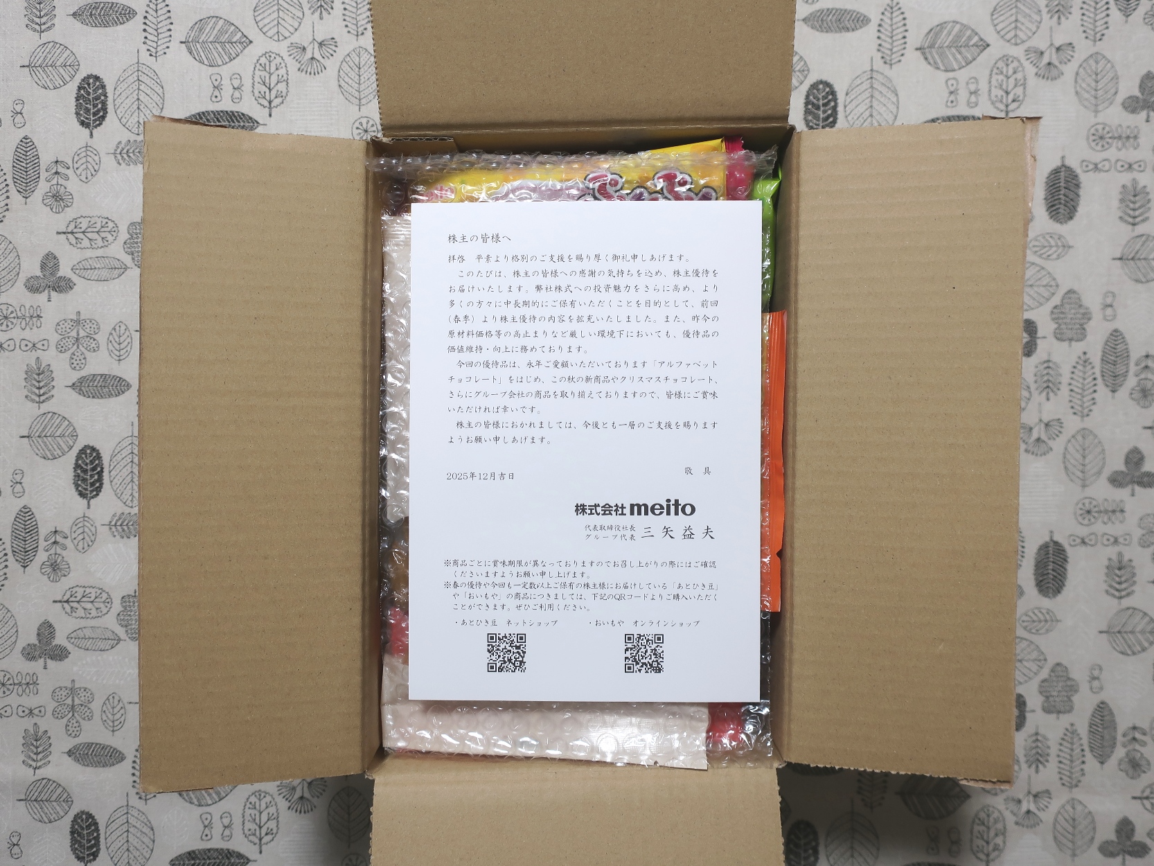 meitoでは、毎年 3月末・9月末 の株主を対象に、自社商品詰め合わせの優待を実施しています。