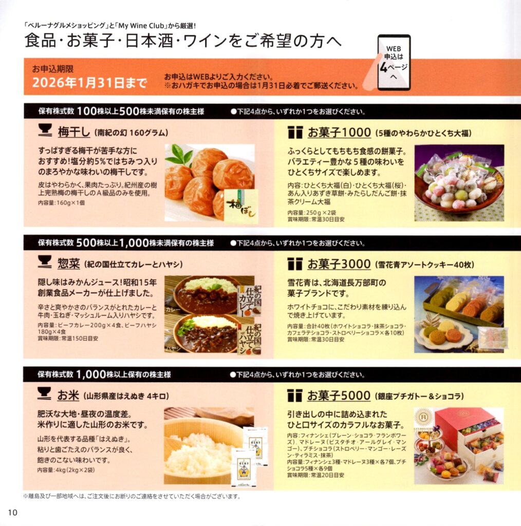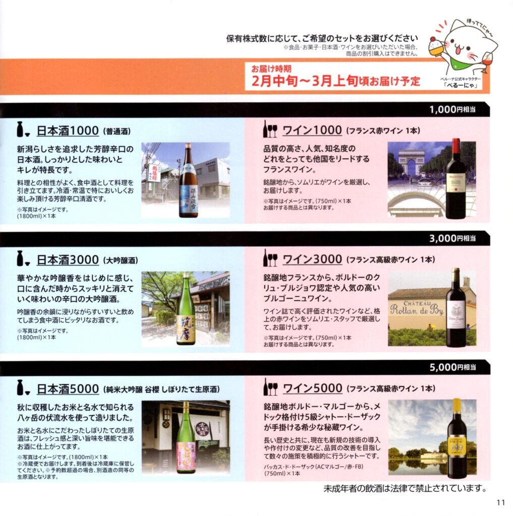 | 1,000株以上 | (5,000円相当) A. ネット専用優待クーポン B. 食品 or お菓子 or ワイン or 日本酒 C. 通信販売優待割引券 | 1,000円の優待割引券 10 枚 |