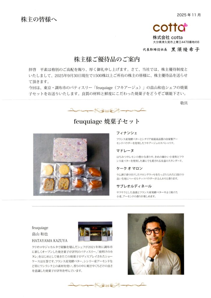 今回は、お菓子・パン作りの材料通販でおなじみの cotta(3359) から届いた株主優待を紹介します。