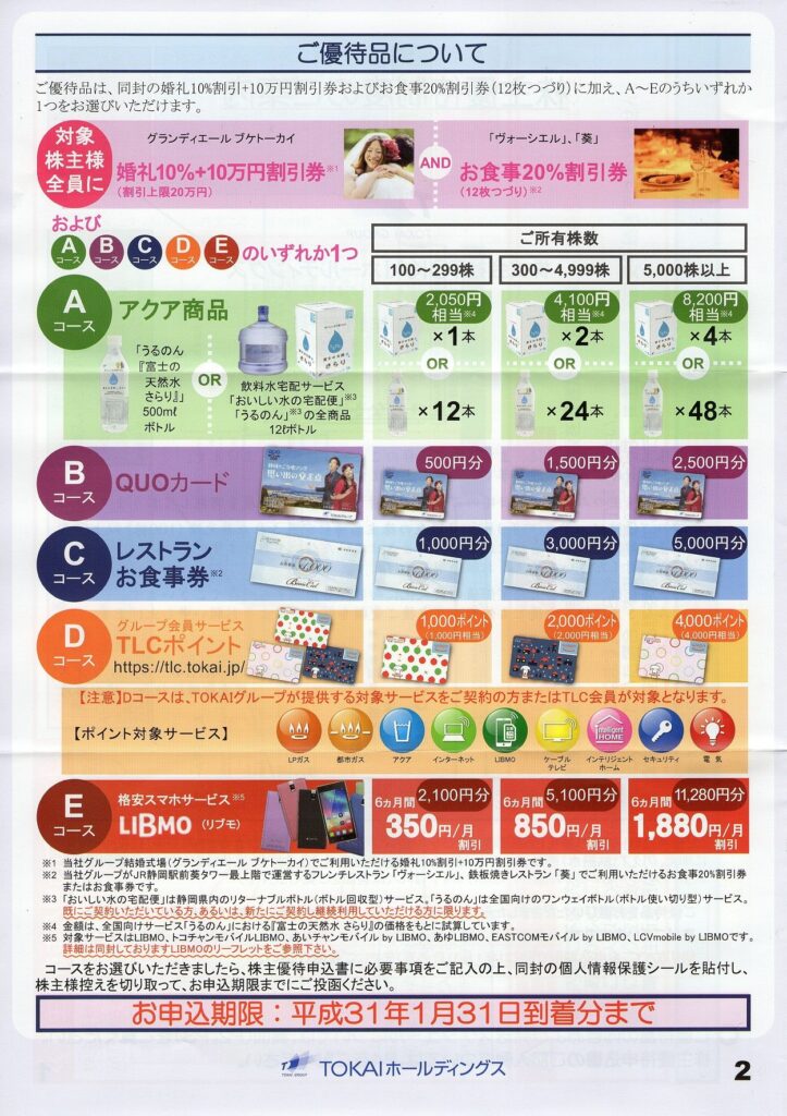 | 100株以上 | 自社グループ商品等の中から一つ選択 (500円~2,100円相当) + 婚礼割引券 & 食事割引券 |
