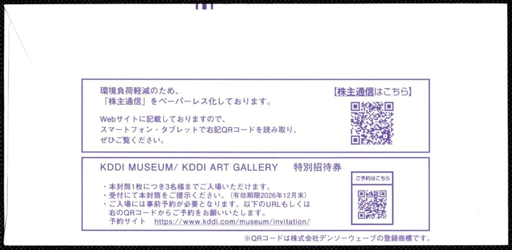 KDDIでは、毎年3月末・9月末の権利確定日に、隠れ優待として「KDDI MUSEUM / KDDI GALLERY 特別招待券 3名分」が届くことがあります。