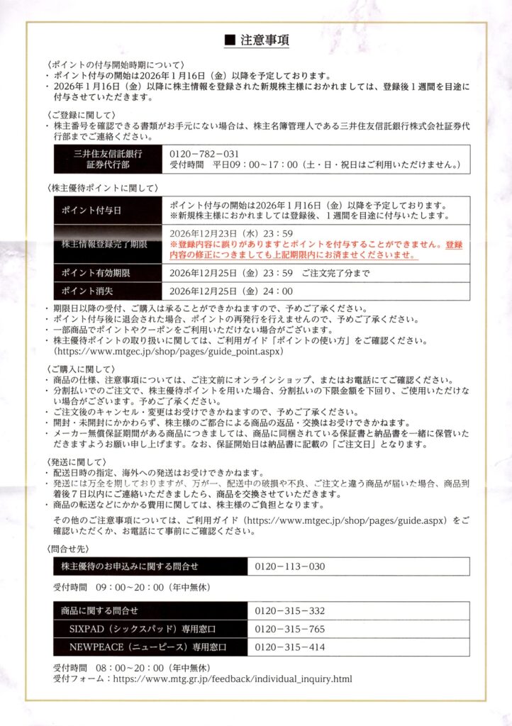今回は、美容機器「ReFa」やトレーニング機器「SIXPAD」で知られる MTG(7806) から届いた優待案内を紹介します。