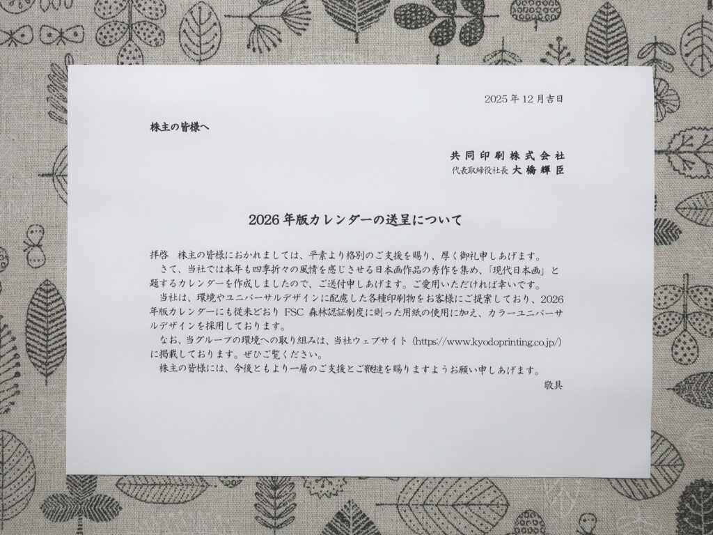 共同印刷(7914)から株主優待(カレンダー)が到着
