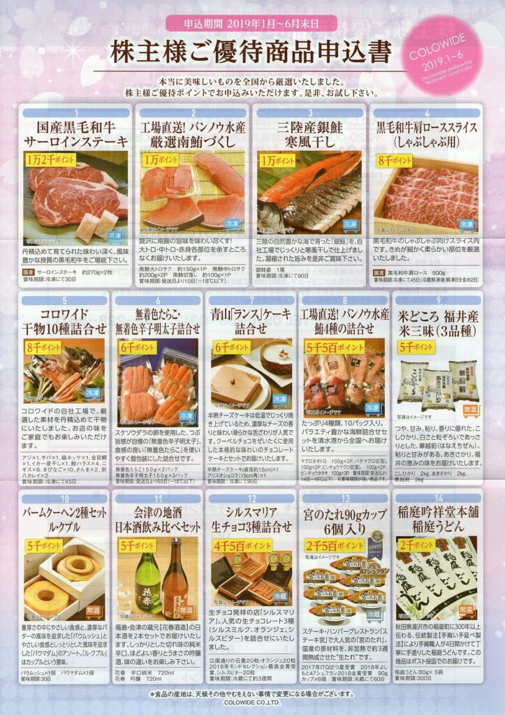 以下のチラシは2019年1月~6月末日までの間に株主優待ポイントと交換できる商品の一覧です。