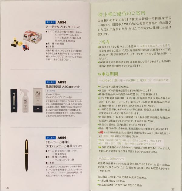 日本管財では、毎年3月末と9月末の株主に対し、保有年数に応じたカタログギフトが贈られます。