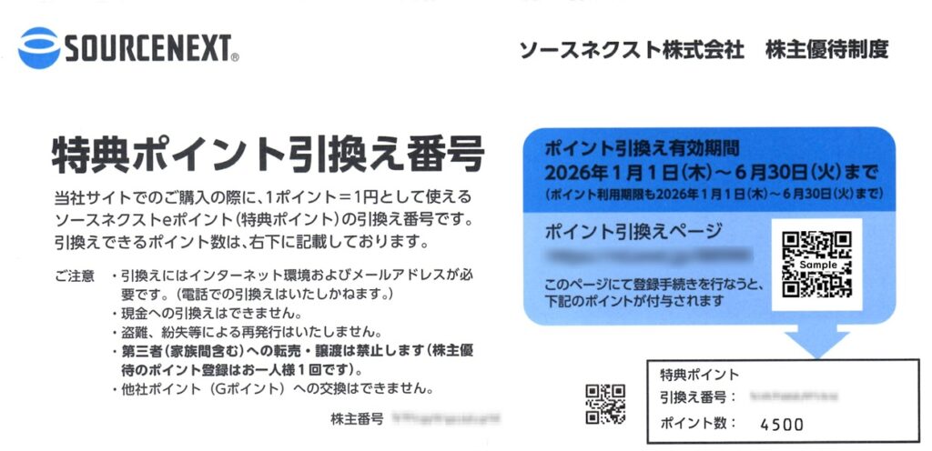 1,000株(1年以上)なので「ソースネクストeポイント(特典ポイント) 4,500pt」でした。