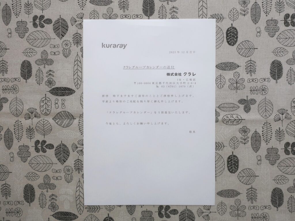 【端株優待】クラレ(3405)から株主優待カレンダーの案内が到着
